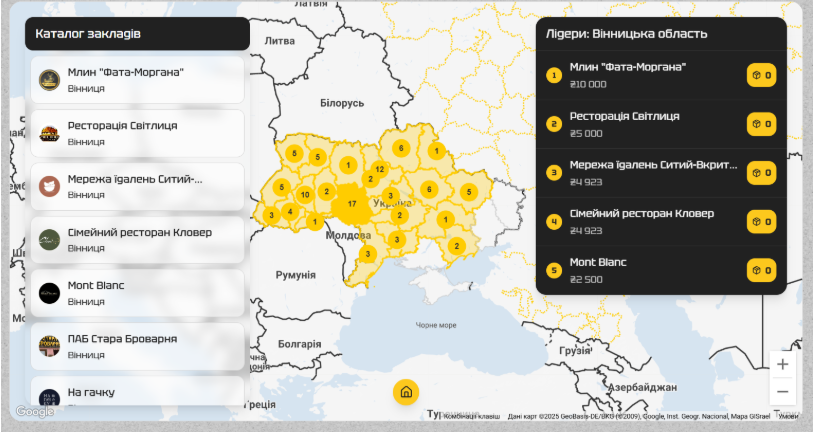 Натепер у лідерах — Вінниччина із 17 закладами, Київщина із 15 закладами та Тернопільщина із 10 закладами. Також у Полтаві вже приєдналося 5 закладів, у одного із яких 13 точок по місту.