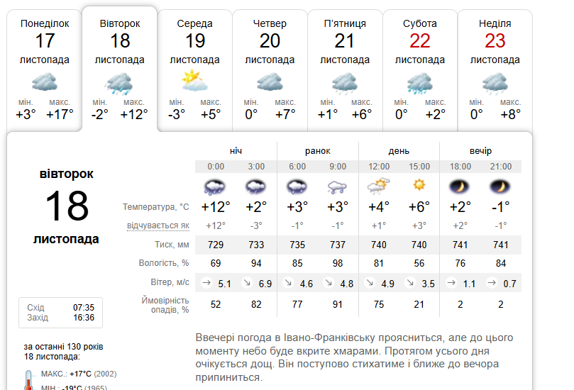 У Франківську температура коливатиметься від -2 до +12 градусів за Цельсієм. Сонце зійде на небо о 07:35, а зайде – о 16:36.