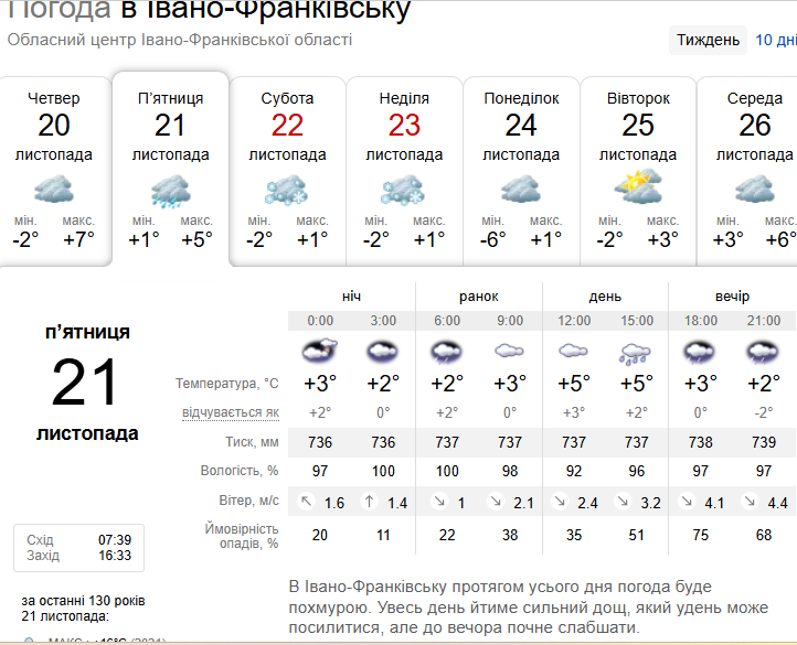 В Івано-Франківську сьогодні, 21 листопада, протягом усього дня погода буде похмурою.