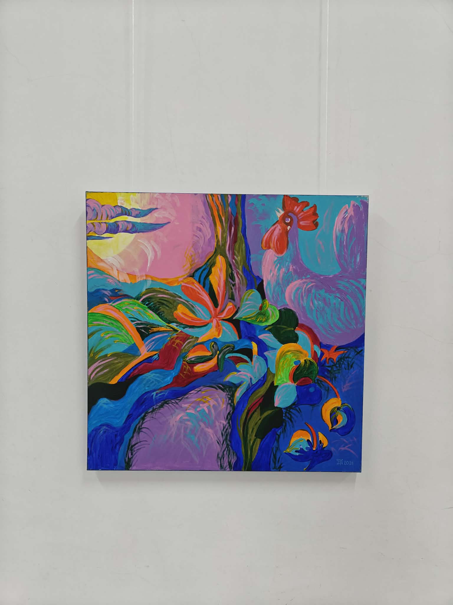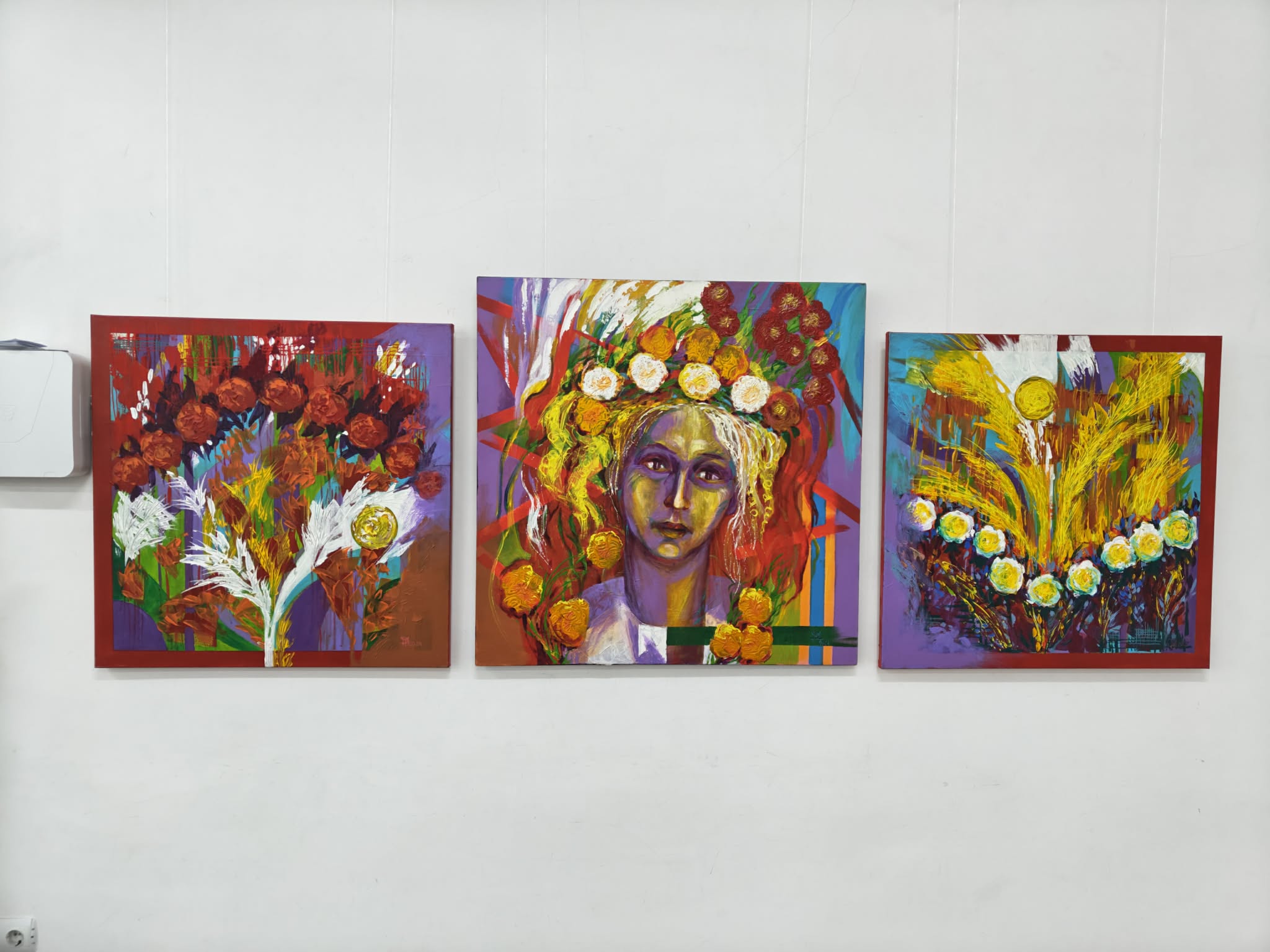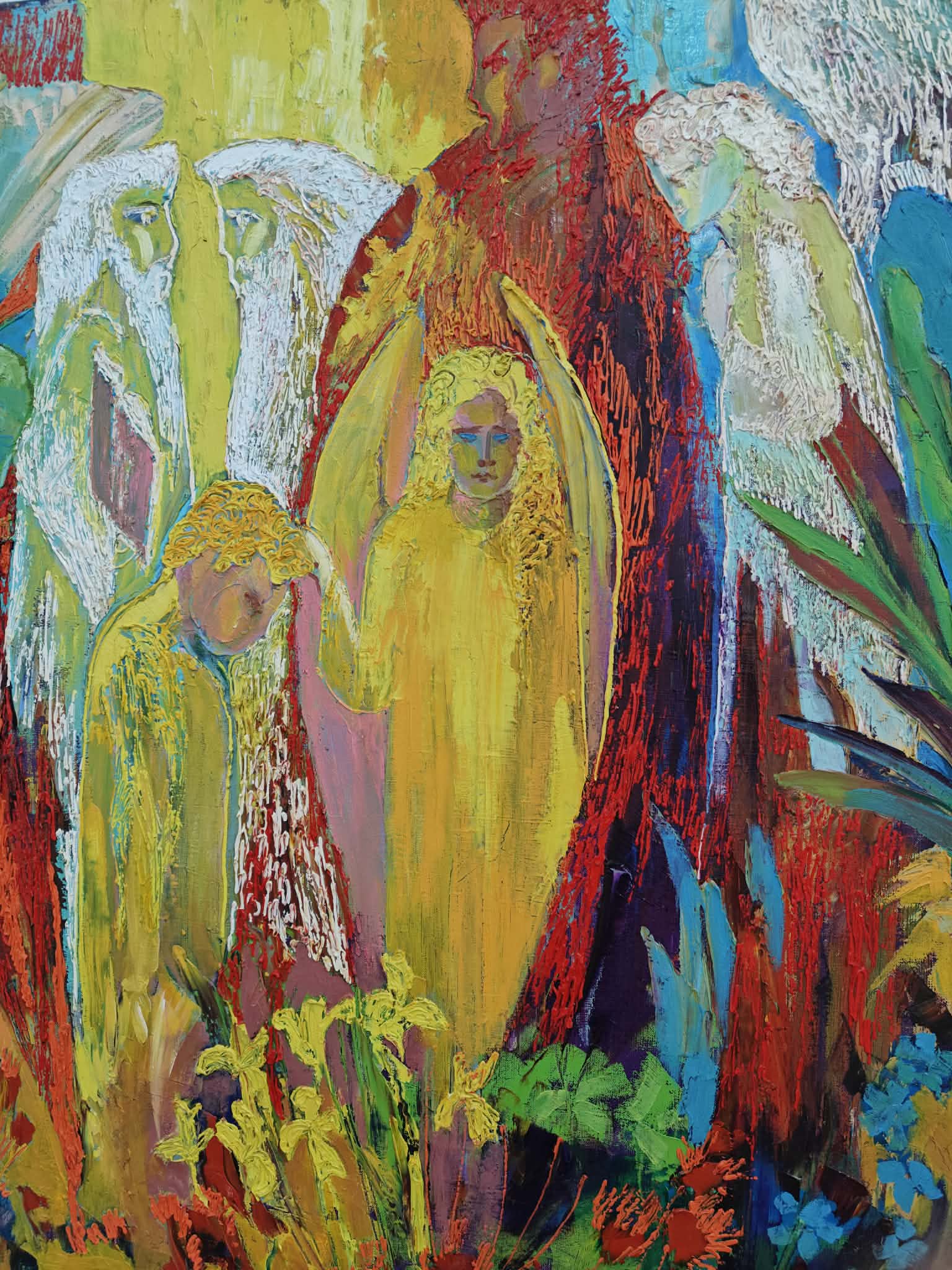 Тих, хто ще не бачив картини цього художника, хочу попередити: «Обережно! Буде яскраво!» Роботи справляють сильне емоційне враження навіть не з першого погляду, а з пів погляду. Насичений червоний, зелений, синій, жовтий. Сміливі і відчайдушні. Мабуть, так і треба нагадувати про загублений рай, що у час війни має не лише біблійні сенси, адже дуже часто часи до повномасштабного вторгнення ми називаємо добрими, щасливими, райськими, шукаємо світло назовні, забуваючи, що воно всередині нас.
